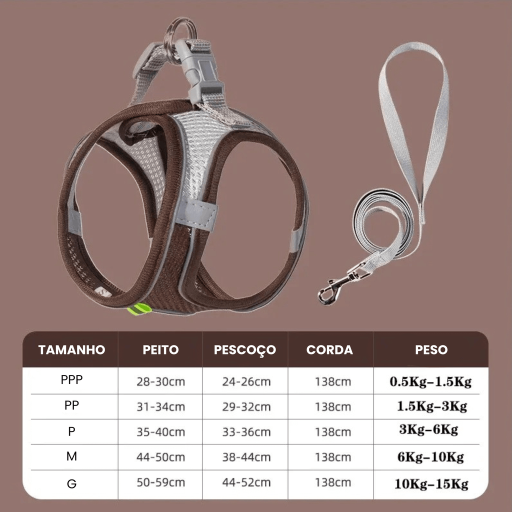 Coleira Peitoral Ajustável com Guia – Conjunto Confortável e Seguro para Cães e Gatos de Pequeno Porte